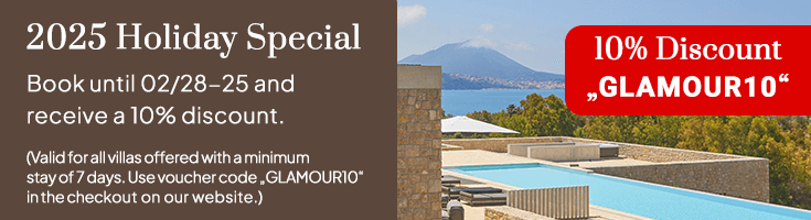Villa Pylos is a representative house with an incredible view over the entire bay. The 250 square metres of living space are spread over two floors. The 11.5-metre glass-bottomed pool and extensive terraces offer privacy and fascinating plays of light in the living and dining area.